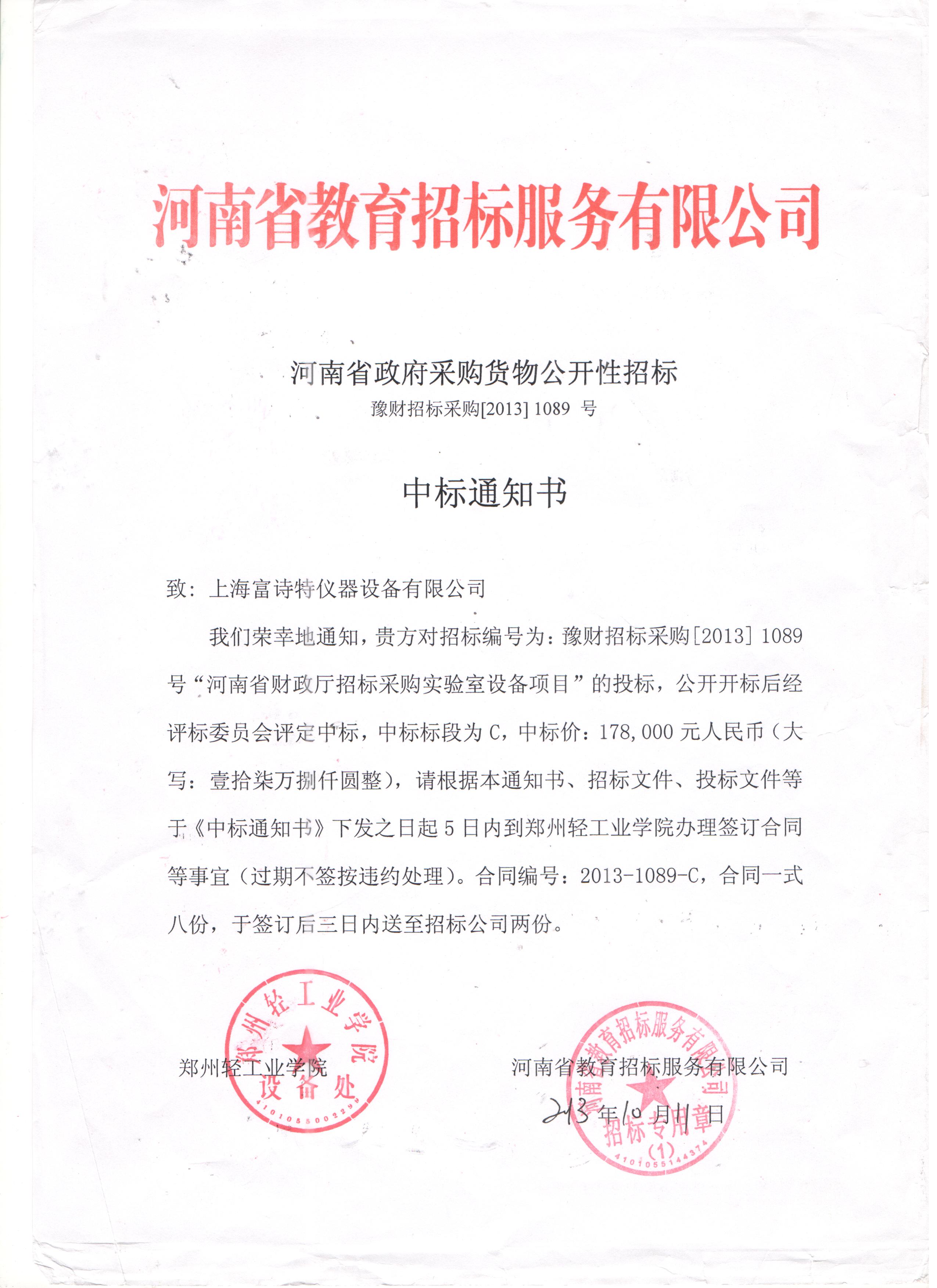 我公司经河南省政府采购厅"采购实验室设备项目"投标,成功中标,感谢河南省政府采购厅评标委员会们的评定.在此在此感谢。